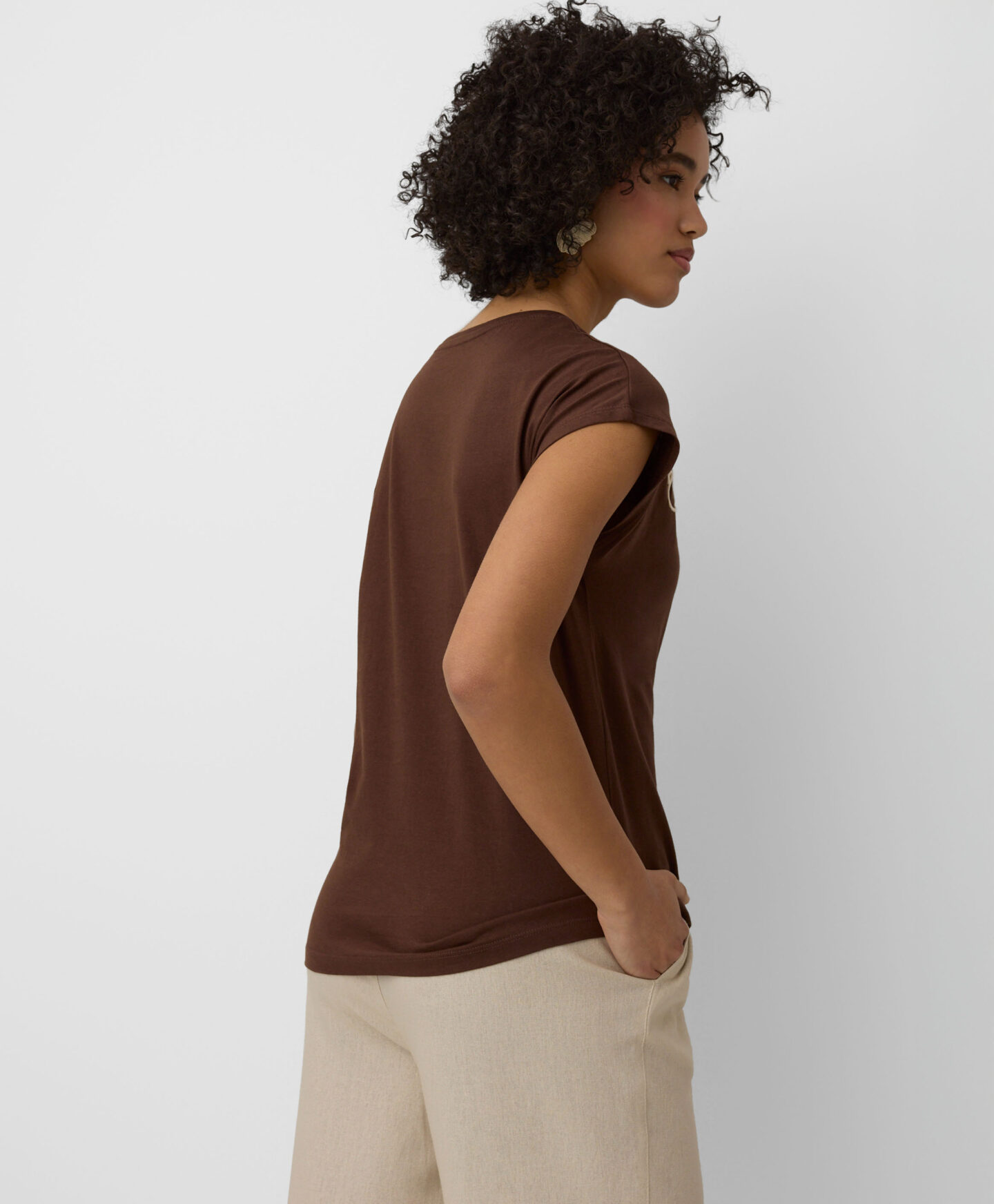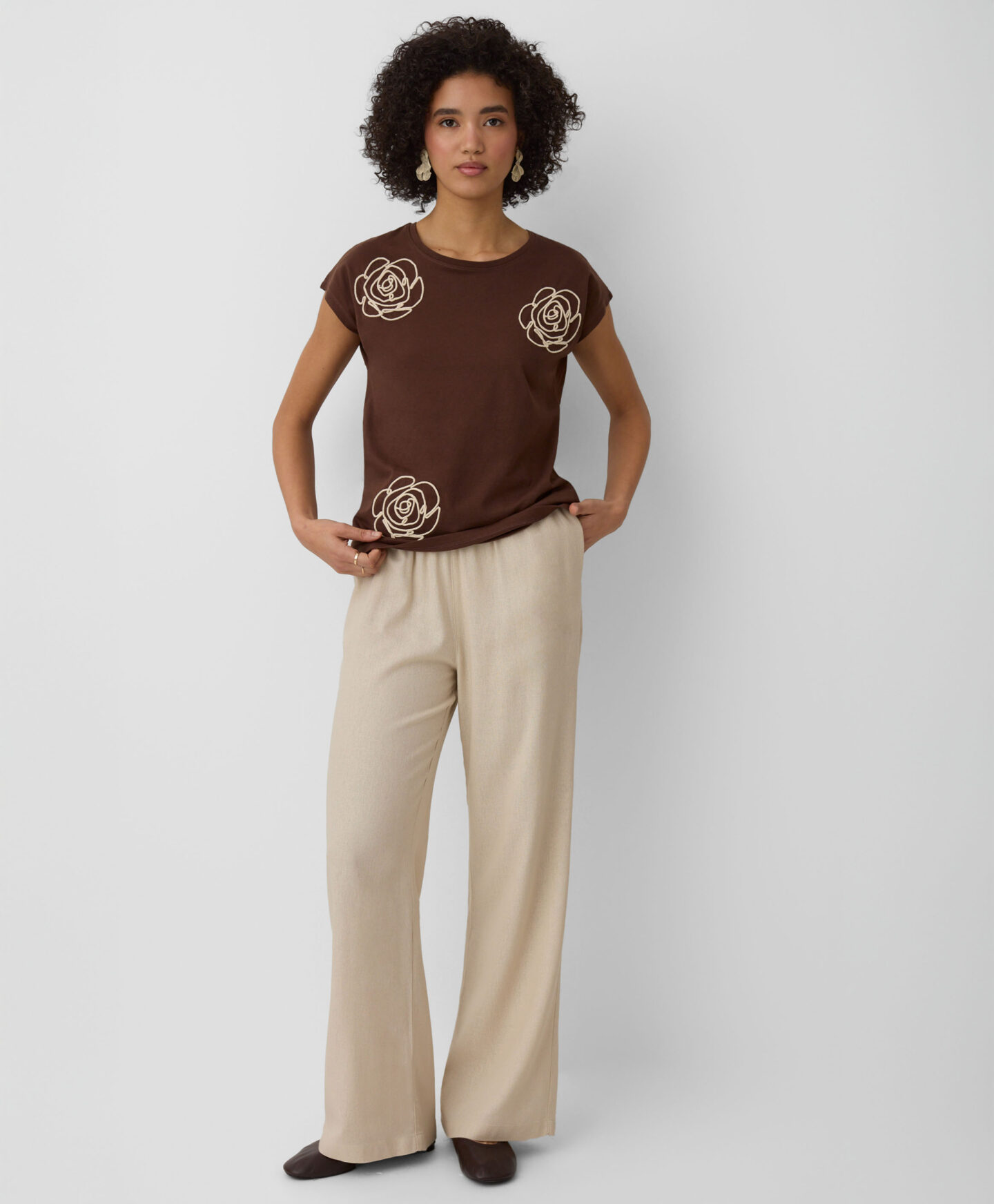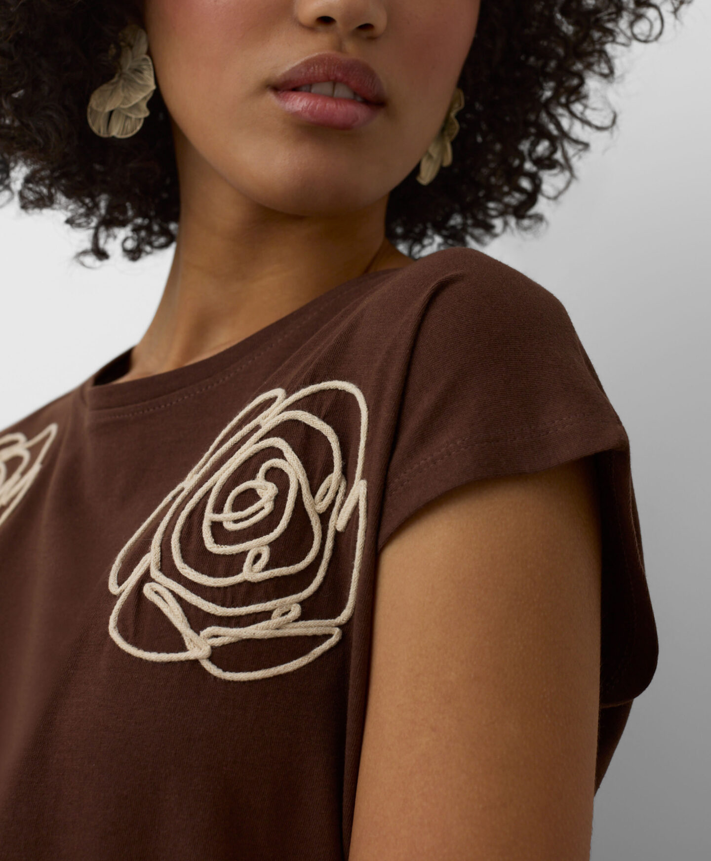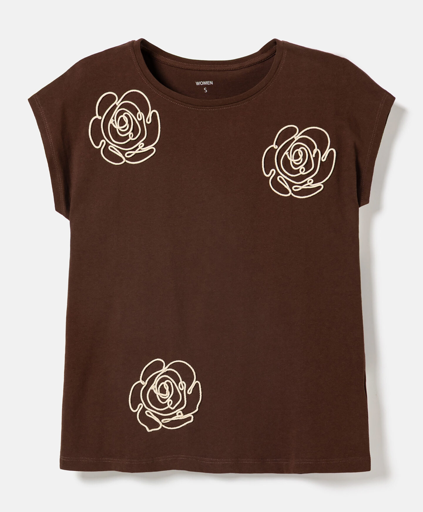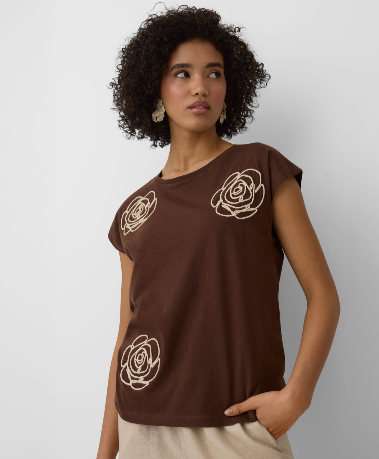 A t-shirt em 100% algodão com estampado floral vai destacar-se no teu guarda-roupa. As rosas bege sobressaem no fundo castanho, trazendo um toque de elegância. O algodão suave permite que a pele respire. Combina com calças de ganga, saia ou calças estilo cigarette.
