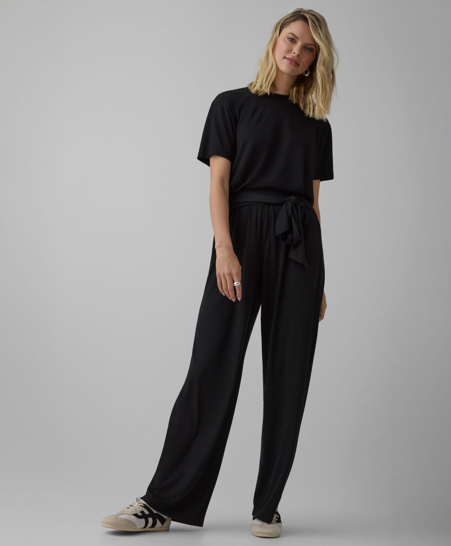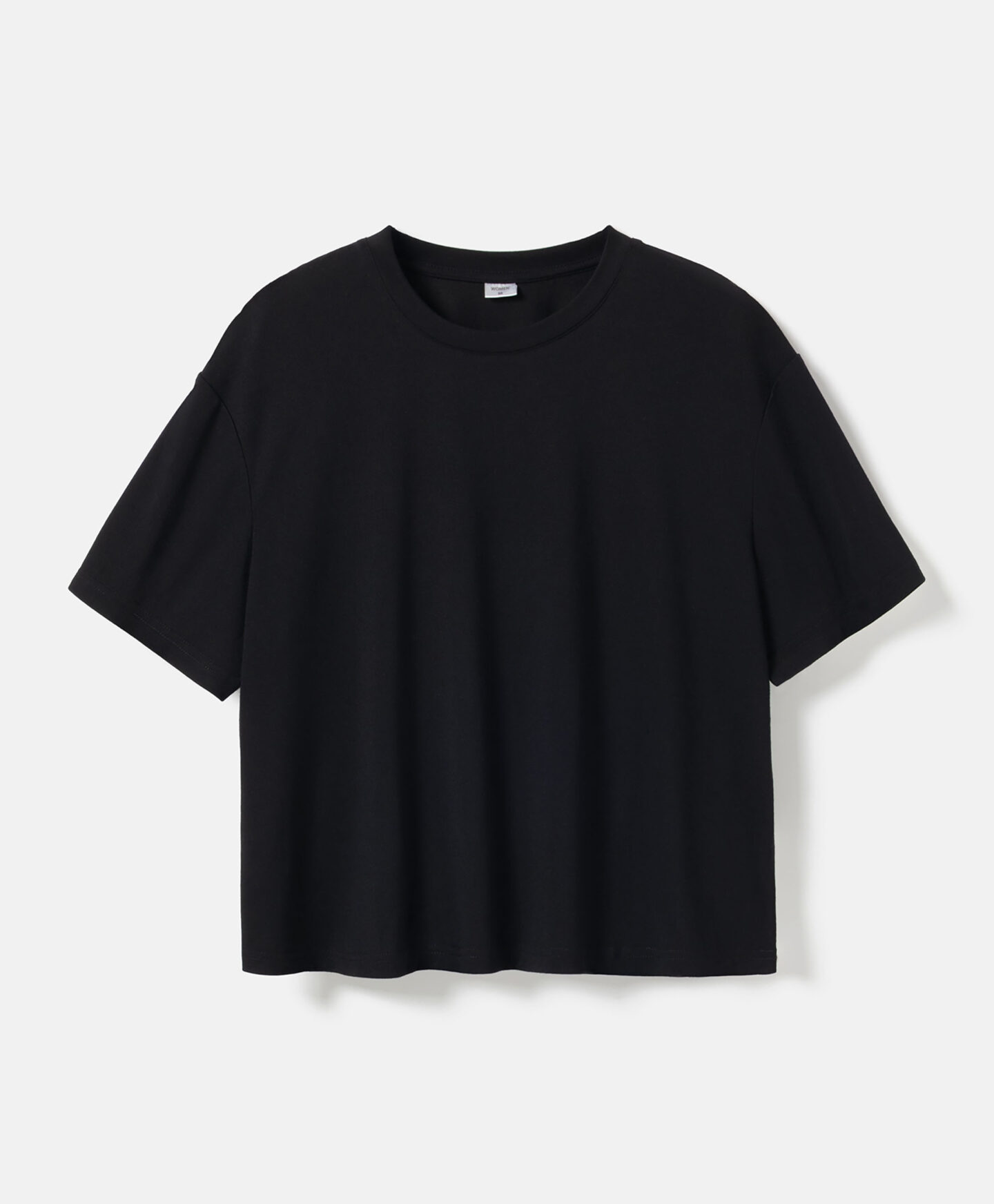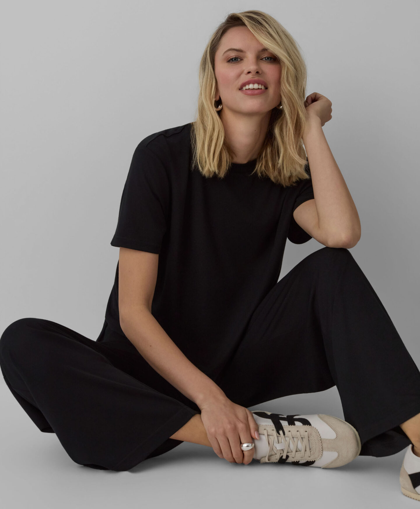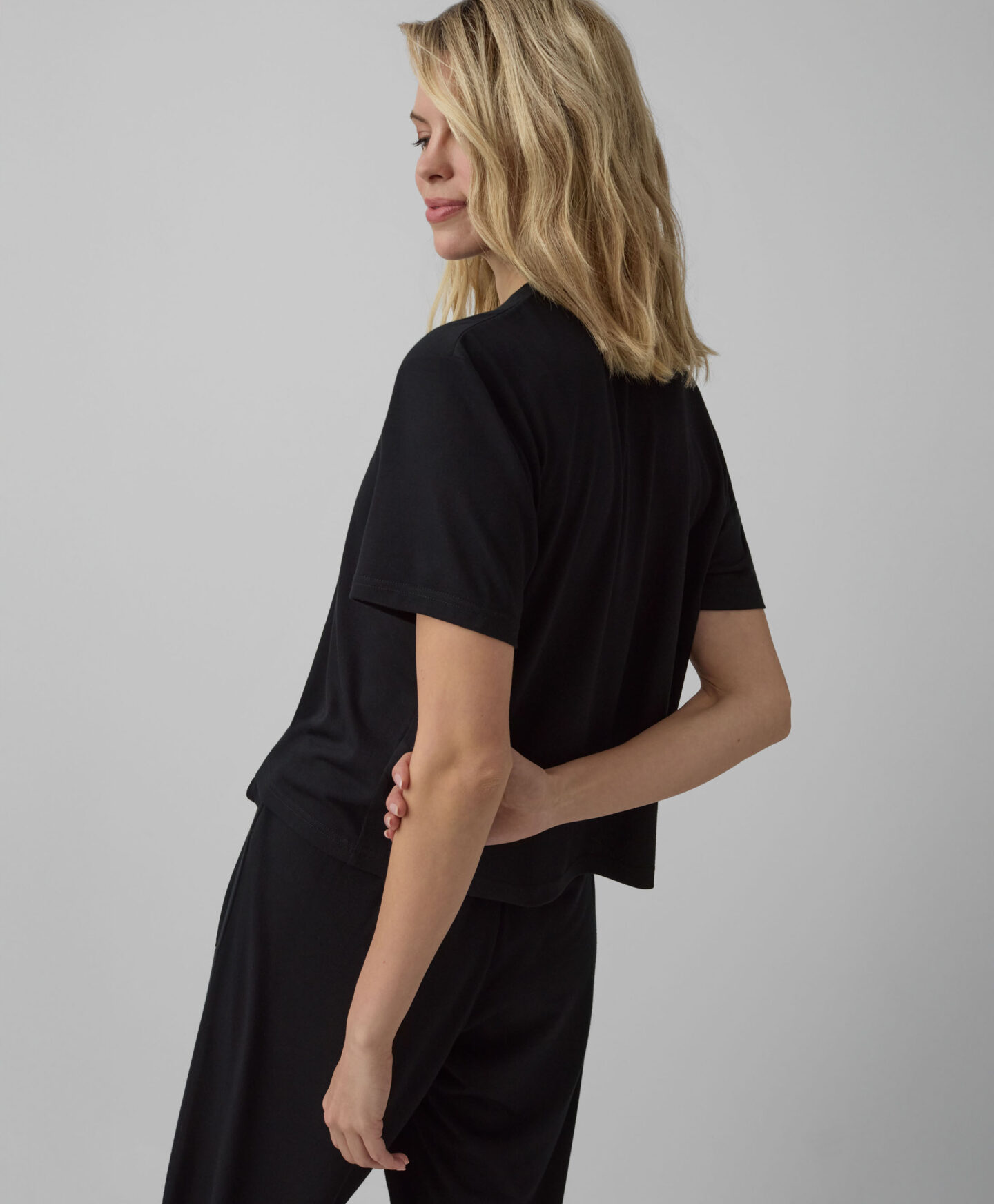 A t-shirt preta de manga curta faz conjunto com as calças com cordão, mas ficará perfeita com a maioria das peças do teu guarda-roupa. Tudo isto derivado ao seu corte clássico e cor intemporal, que nunca sai de moda. O material feito em viscose torna-a leve e suave ao toque. A t-shirt vai garantir-te conforto durante o dia todo. Duas variantes disponíveis na coleção.