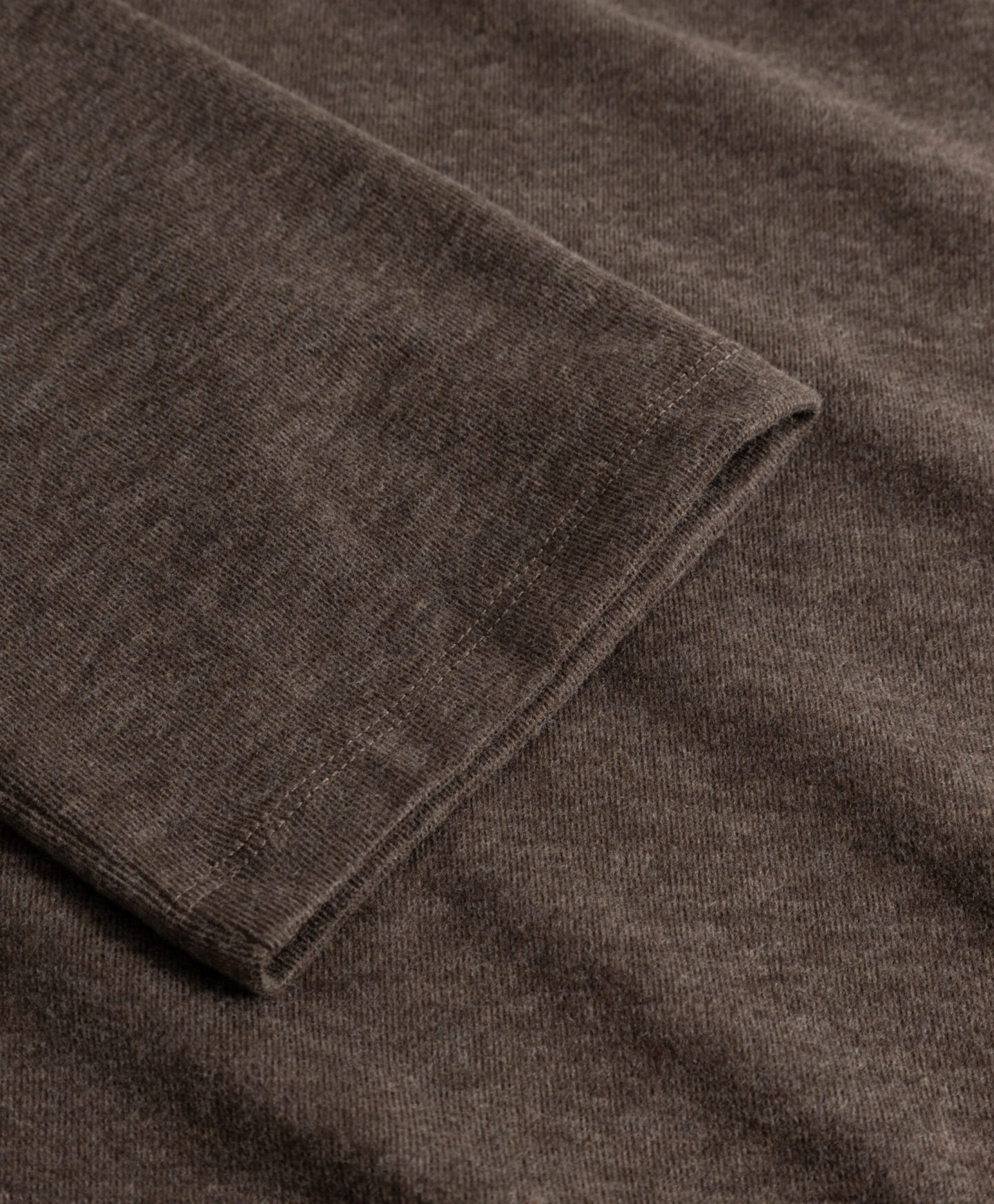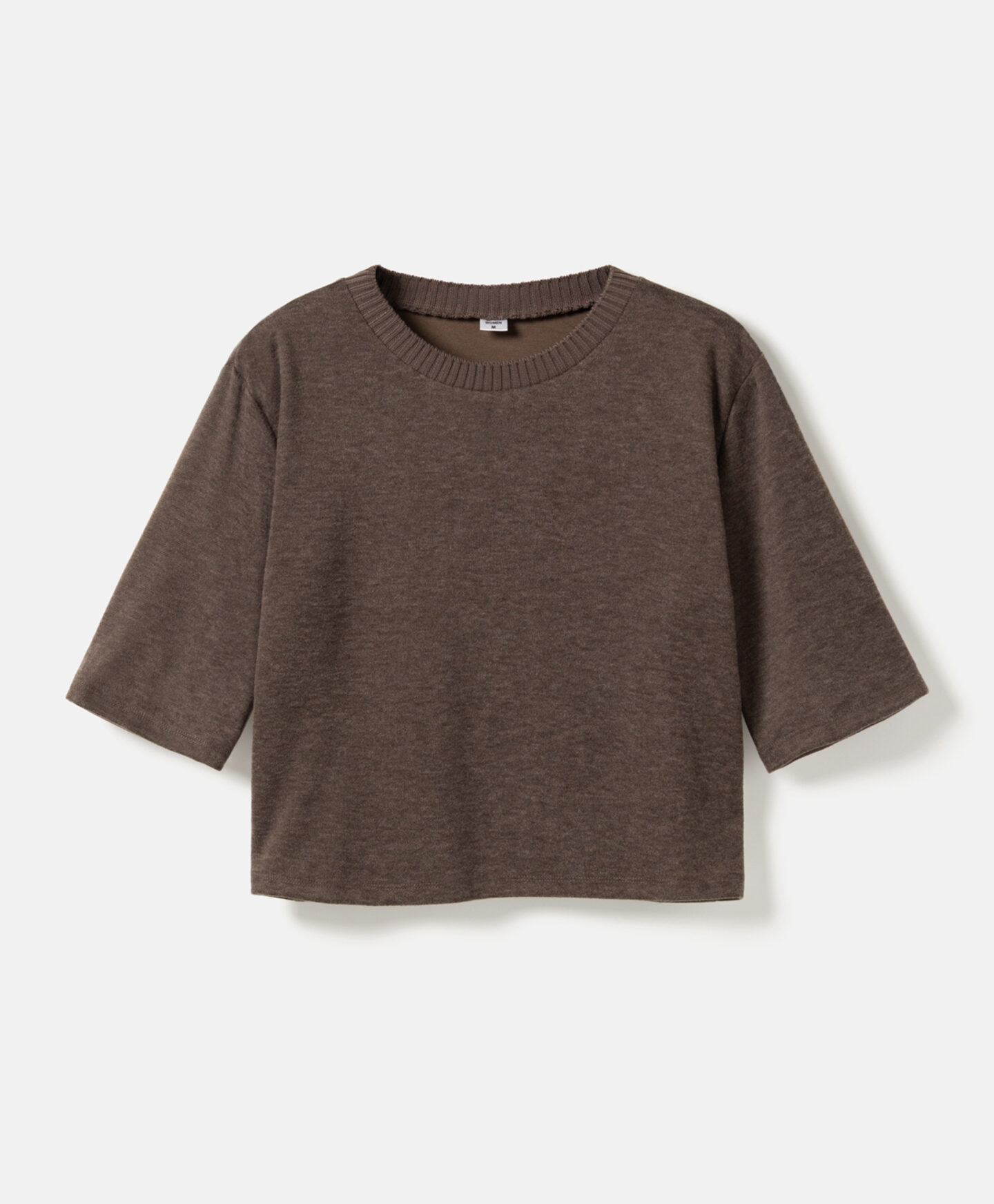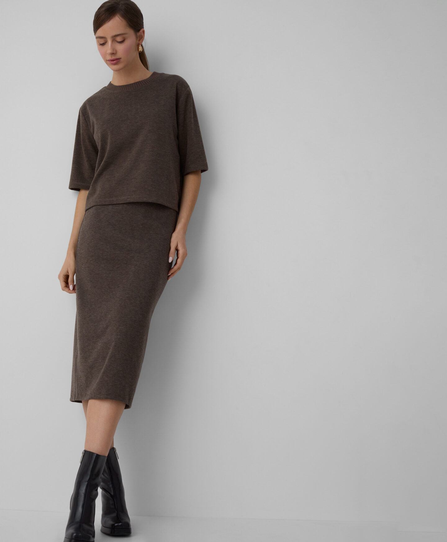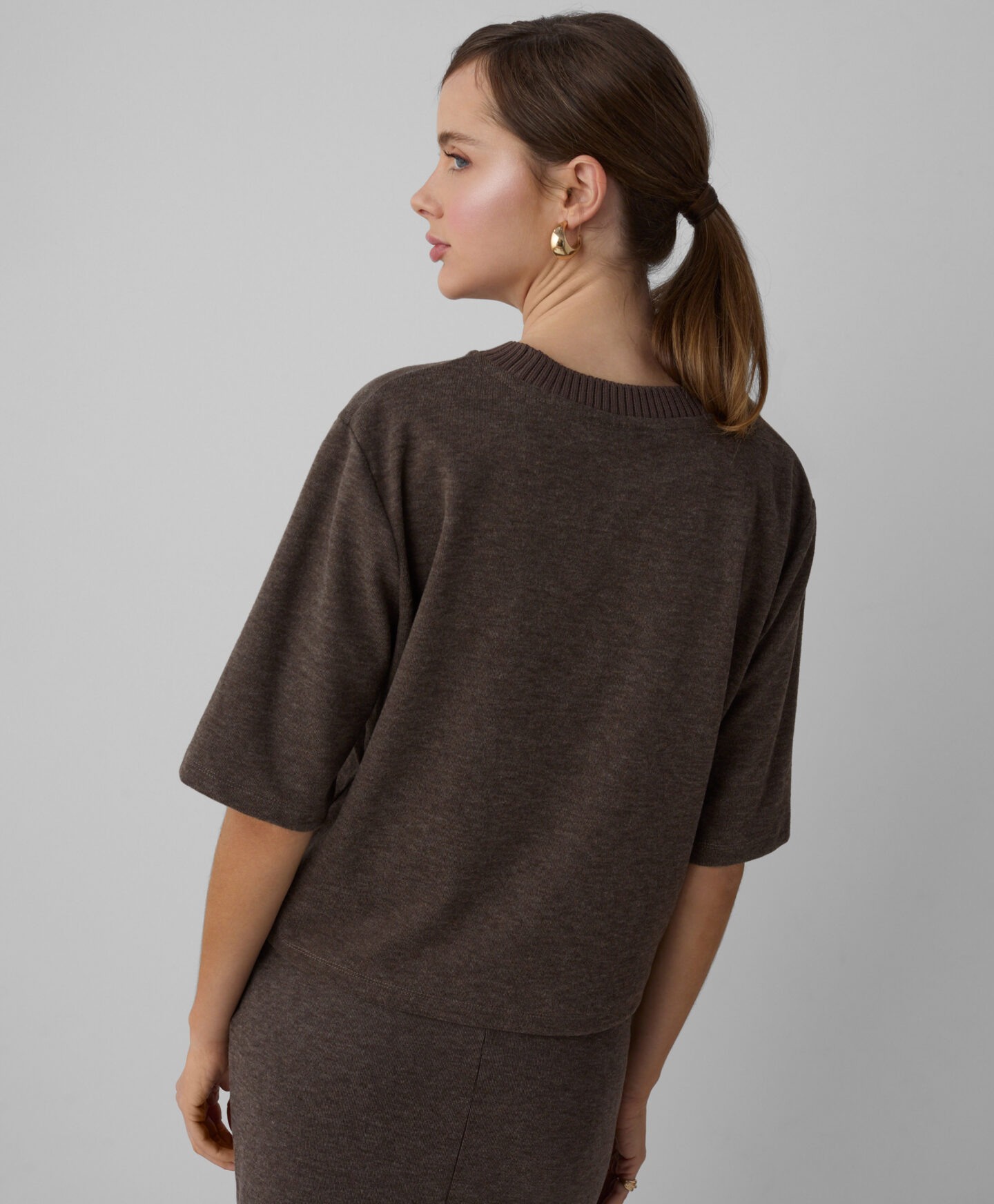 A t-shirt com acabamento em malha combina na perfeição com uma saia midi e calças da mesma coleção. O corte largo oferece liberdade de movimentos e conforto. O tipo de tecido acrescenta carácter a qualquer conjunto, criando um efeito elegante. O tom castanho profundo encaixa perfeitamente no espírito de outono-inverno.