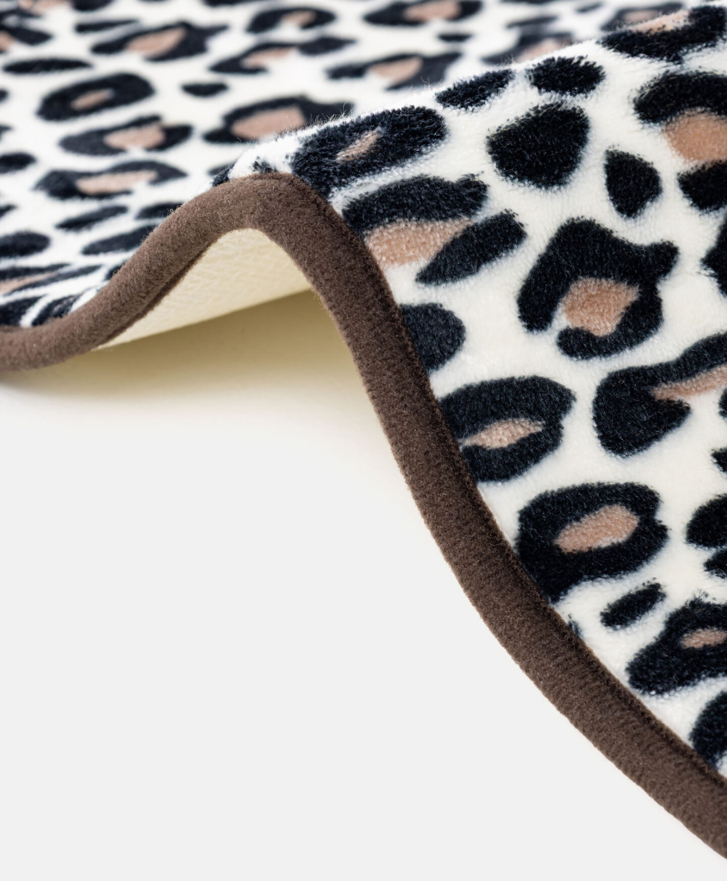 O tapete de casa de banho, com padrão às manchas, traz a natureza selvagem com um estilo único. O tema vibrante é irreverente, criando um contraste original na divisão.