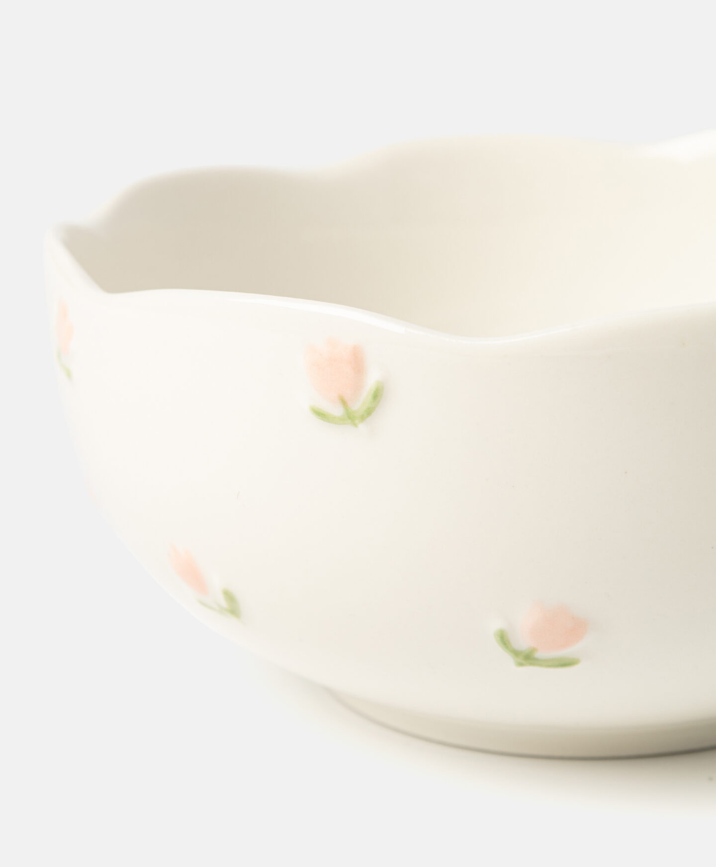 A tigela em porcelana, com padrão delicado de tulipas, será um destaque garantido na tua cozinha. O design decorativo em formato irregular torna-a única. Cria o conjunto perfeito com a chávena e o prato da mesma coleção.