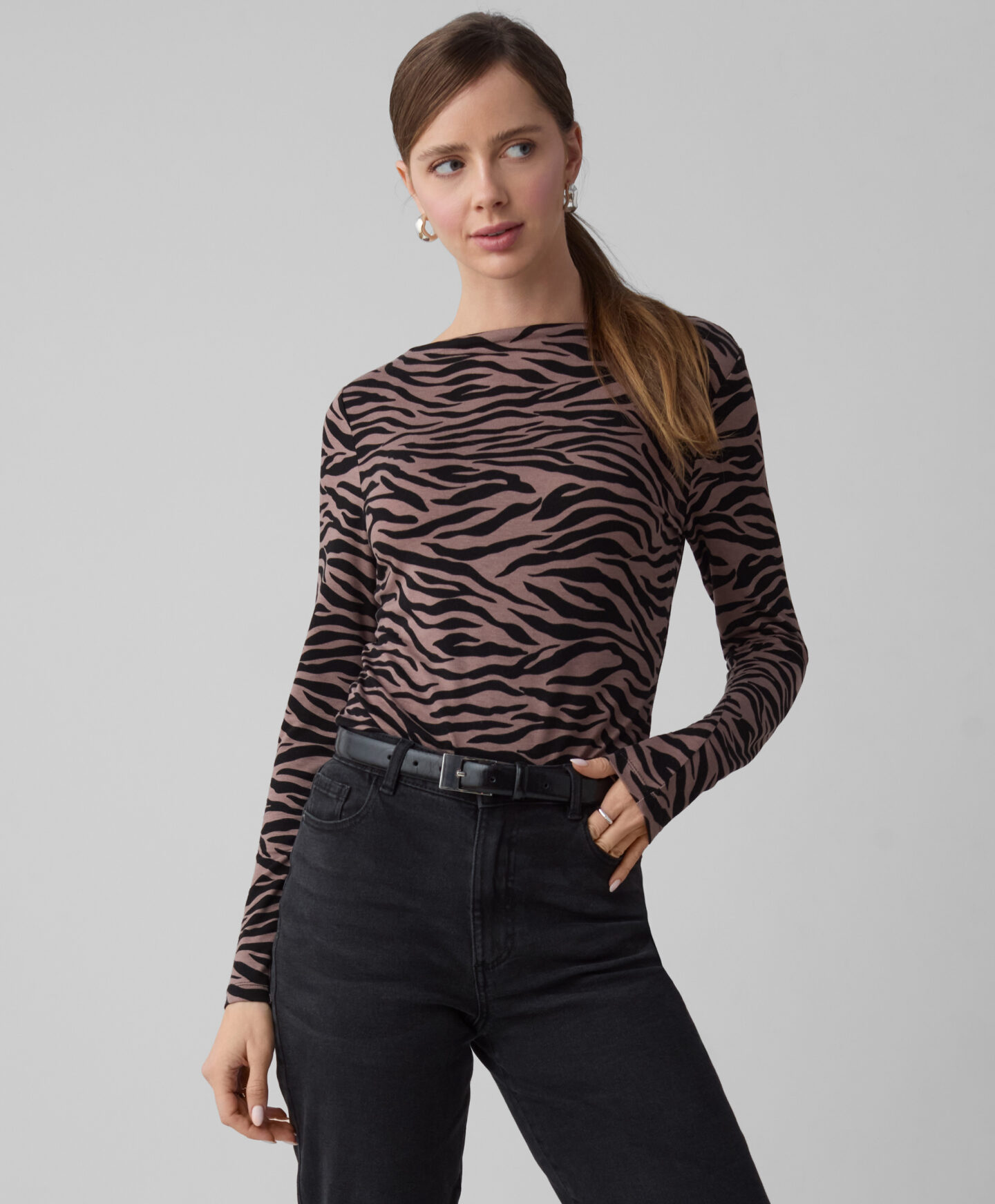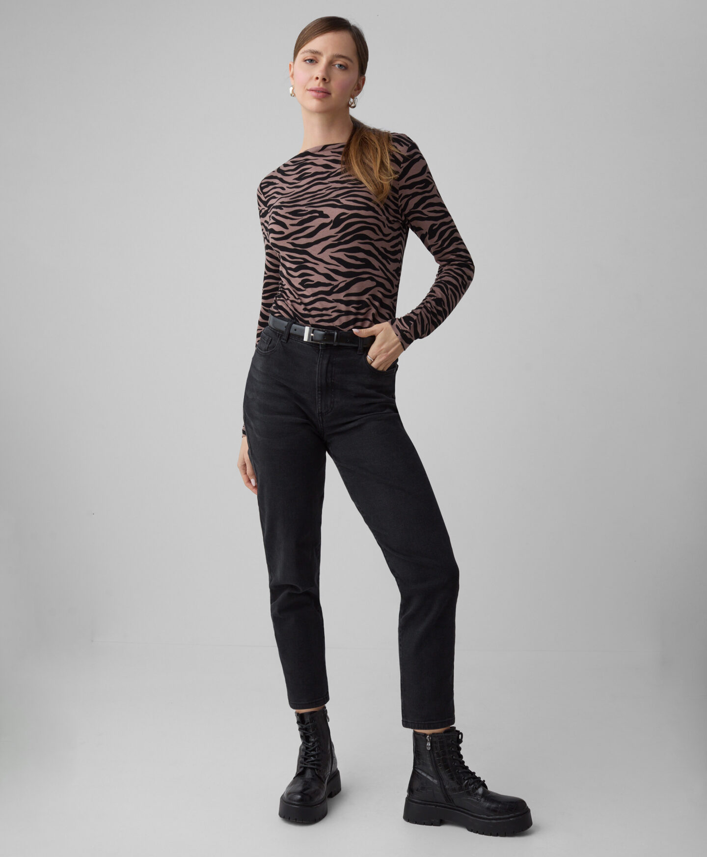O top com padrão tigre é uma escolha ideal para quem quer um look estiloso. É macia, respirável e agradável de usar. O elevado teor de viscose faz com que tenha um bom ajuste, garantindo conforto ao longo do dia. Podes combiná-la com calças elegantes e botins para um look clássico, ou com jeans para um estilo mais casual.