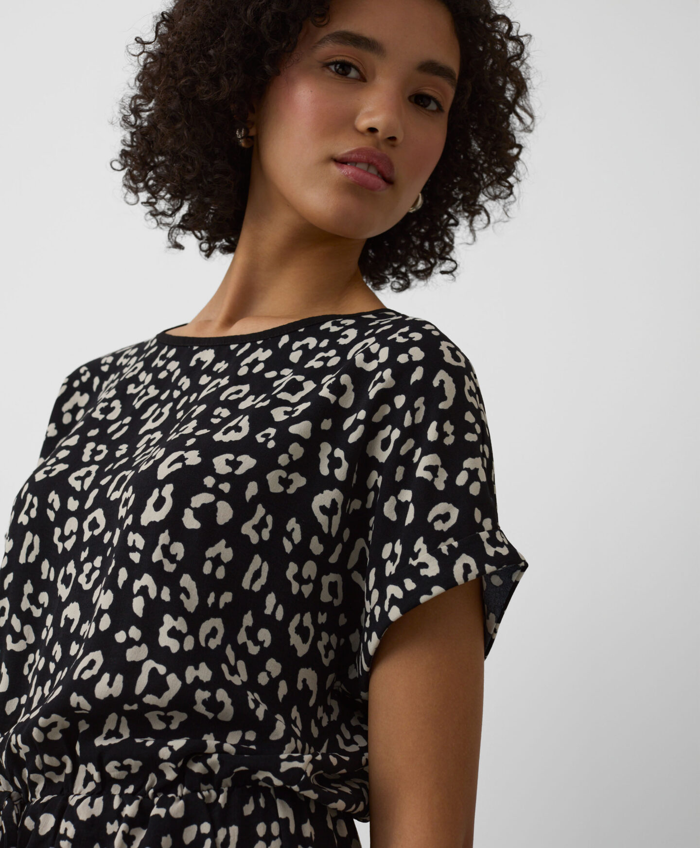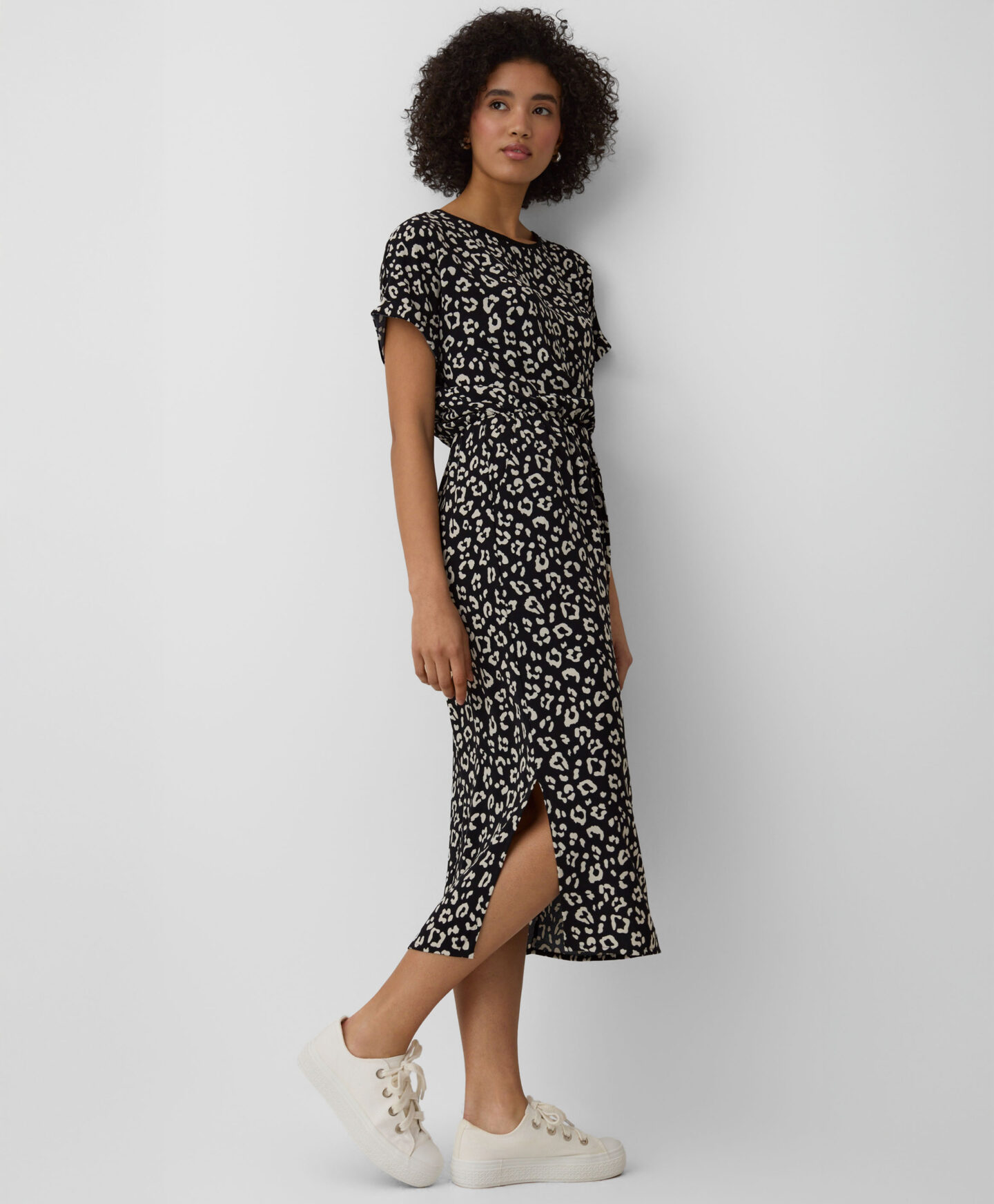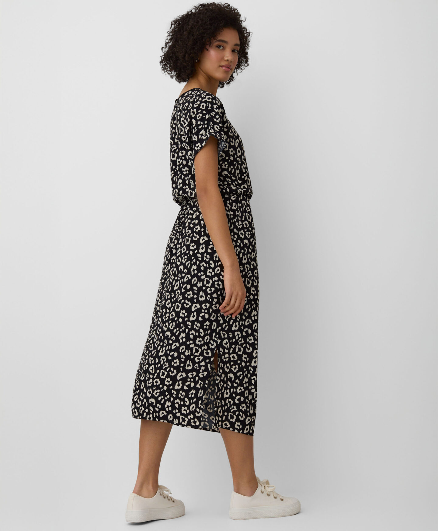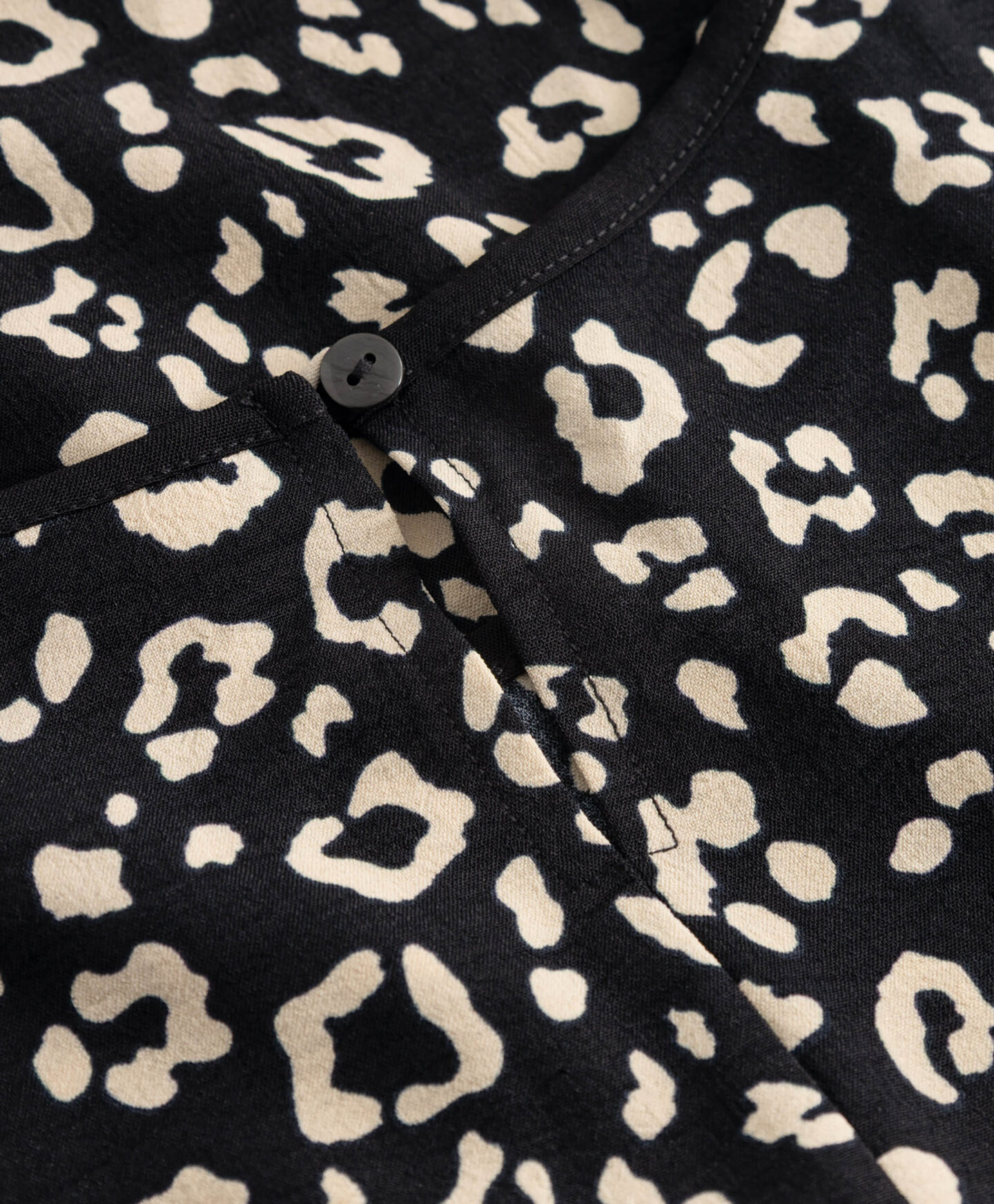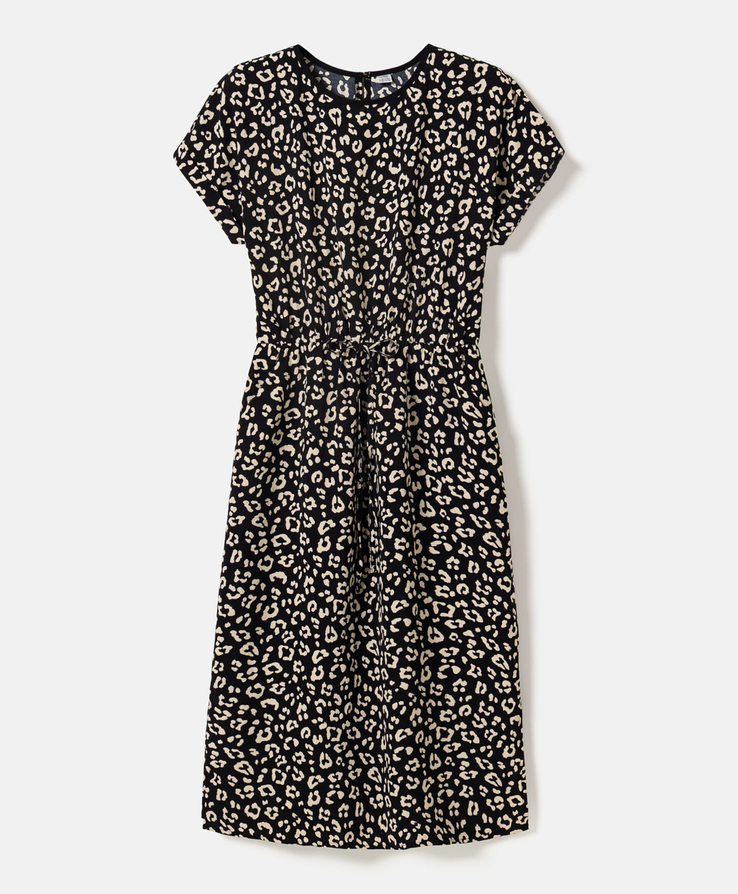 O vestido com padrão de leopardo é versátil e cheio de personalidade, perfeito para o dia a dia. O cordão na cintura ajuda a criar o ajuste ideal para cada silhueta. Combina com casacos de ganga ou blazers.