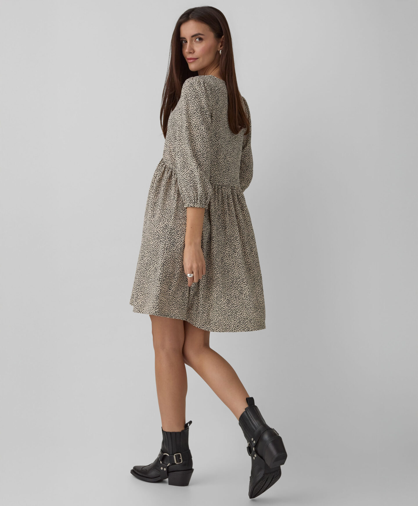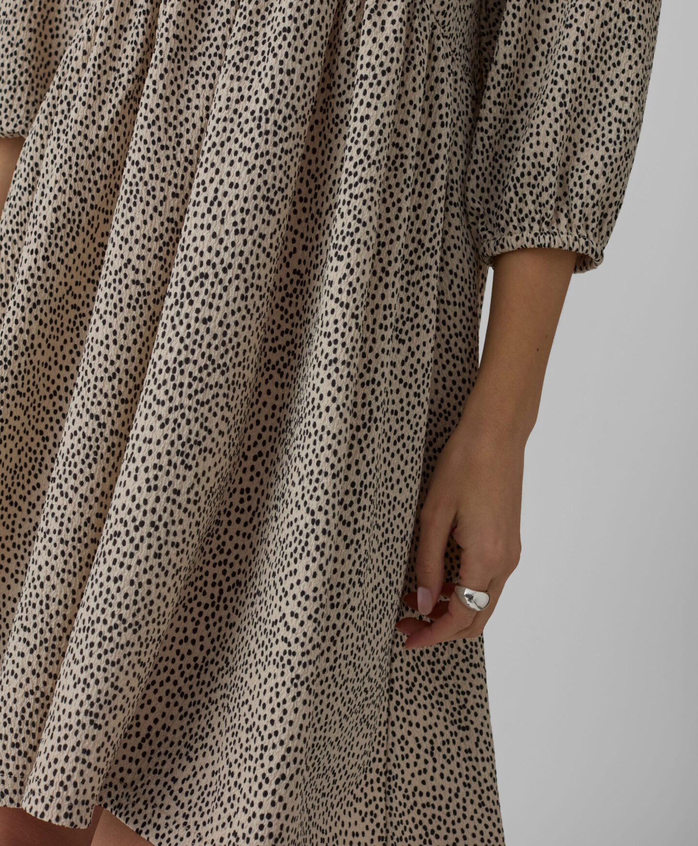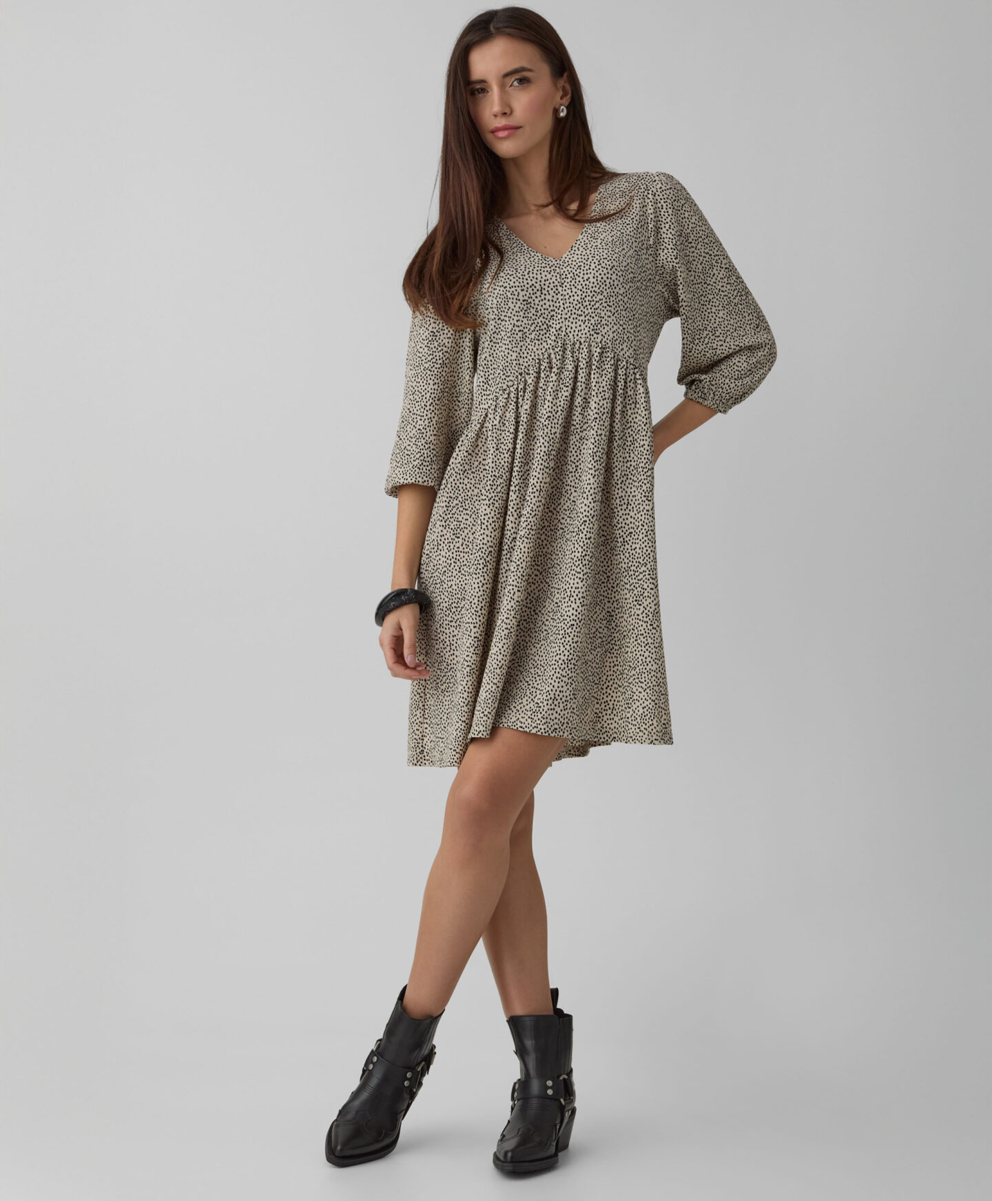 O vestido com pregas destaca-se com o seu padrão irregular. O detalhe das pregas cria um formato 3D que se molda à silhueta. A gola em V destaca o pescoço e torna o look muito leve. Feito com materiais suaves que garantem conforto durante todo o dia. Combina-o com os teus sapatos favoritos.